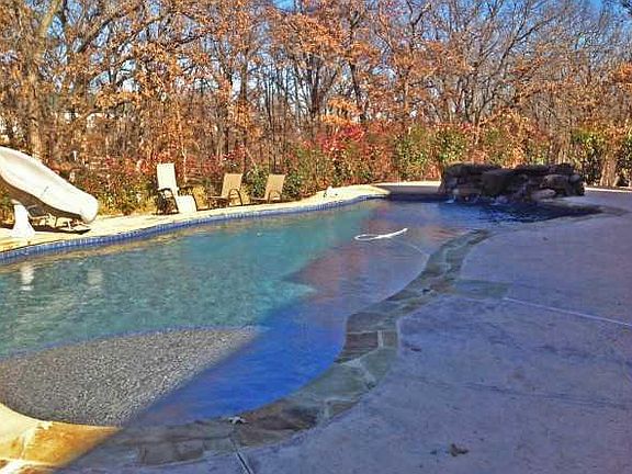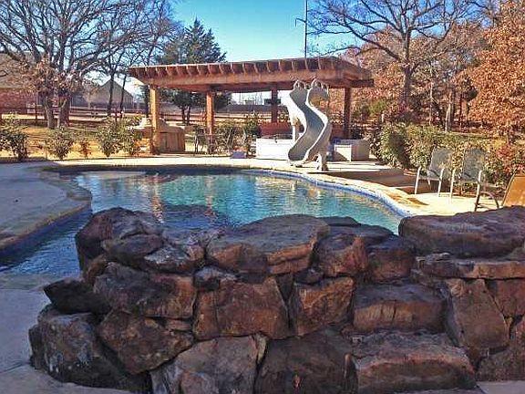 Treed acreage home with stunning pool and outdoor living & cooking area with spectacular views which will take your breath away.....Features include: Interior fire suppression system, stained concrete floors with radiant heat, stainless appliances with double ovens, granite counters, built-in booth in breakfast area & desk, dual-fuel heat & air. Generator. Bonus room up. Options with this home, 4th bedroom makes a great study. Welcome home.