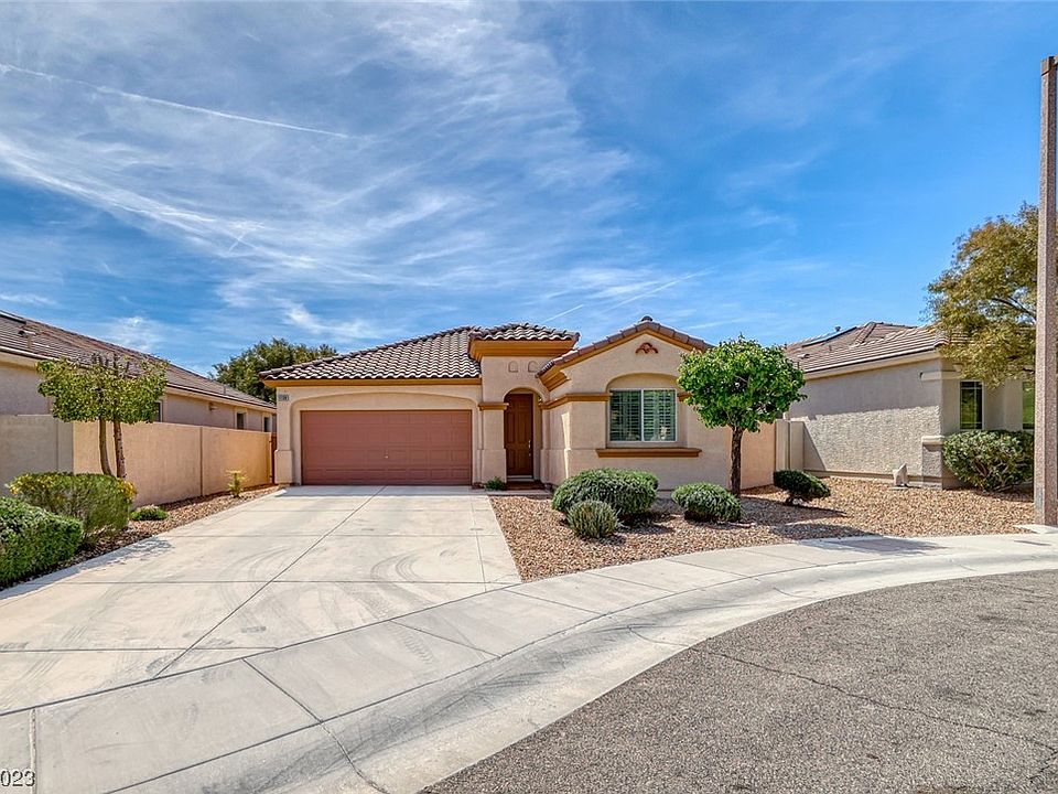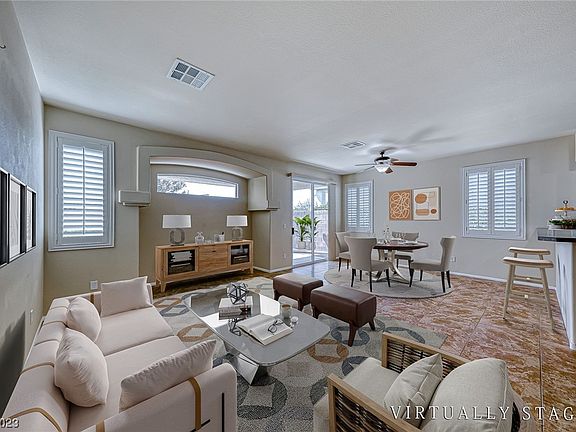 Beautiful Summerlin single story on quiet culd de sac. Open floorplan. House features ceramic tile throughout w/carpet in the bedrooms, two tone paint & plantation shutters. Kitchen w/new white raised cabinets w/soft close doors & drawers, breakfast bar w/granite counters, SS appliances, recessed lights, reverse osmosis & pantry. Dining room off kitchen & living room w/ceiling fan & light. Living room w/cut out media niche. Primary bed w/ceiling fan & light, 5x10 walk in close w/mirrored doors. Primary bath w/dual sinks w/cultured marble counters, new white raised cabinets, sep jacuzzi tub & shower w/linen cabinets. Bed 2 w/french doors & mirrored closet doors. Bed 3 w/mirrored closet doors. Bath 2 w/new white raised cabinets, cultured marble top & tub/shower combo. Laundry w/cabinets & sink. Add'l linen cabinets in hall to primary bed. Garage w/epoxy floors, soft water system, built in cabinets. Backyard w/covered patio, concrete slab, pavers, synthetic grass & desert landscaping.