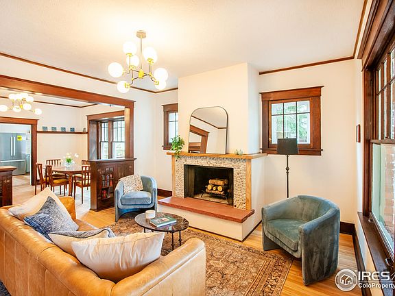 This sweet Arts and Crafts Bungalow in Old Town Longmont just a block from Central Elementary and Thompson Park has had a stylish refresh yet you'll feel its authentic history. Gracious south facing front porch with a porch swing and plenty of room for a sitting area. Enter into the friendly living area with archetypal dark woodwork and the newly finished original wood floors creating a clean yet cozy feel. Fabulous kitchen with powder blue painted cabinets, quartz countertops and brand new stainless steel appliances ready for your culinary creations. The 2 roomy main level bedrooms share a full bathroom. Or make one of the bedrooms the den or library. The primary bedroom and 2nd bedroom are upstairs and have large closets unusual for the era. You'll enjoy the fresh new upstairs bathroom with 2 sinks and an oversized shower. The deep back yard with huge shade trees is ready for summer outdoor games or al fresco dining, so send out the invitations! The detached garage also has a separate potting/garden shed. Take a leisurely walk to The West Side Tavern for dinner or head to Main Street for coffee at Ziggy's or Happy Hour on the The Roost!
