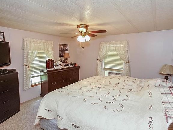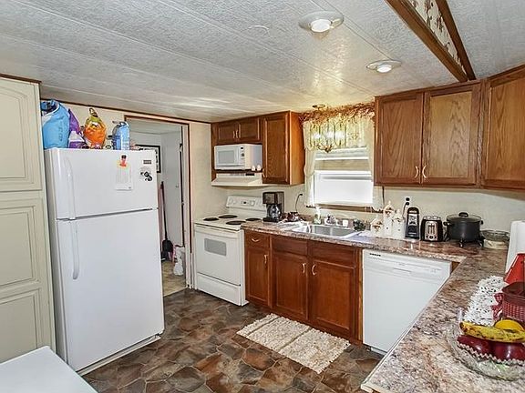 Open design plan doublewide set in Holiday Mobile Home Park! Living room has a woodburning fireplace, Oak kitchen with appliance package and dining area, rich wood floors, covered deck and lawn shed. Newer roof, siding, windows, furnace and hot water heater. Lot rent includes sewage, water and trash services.