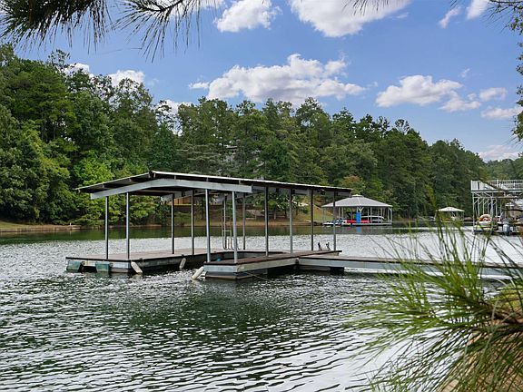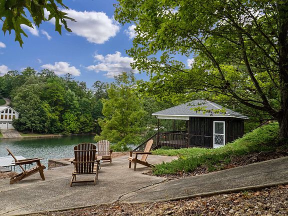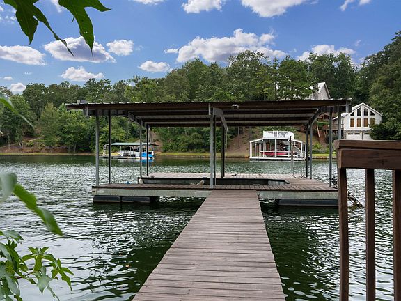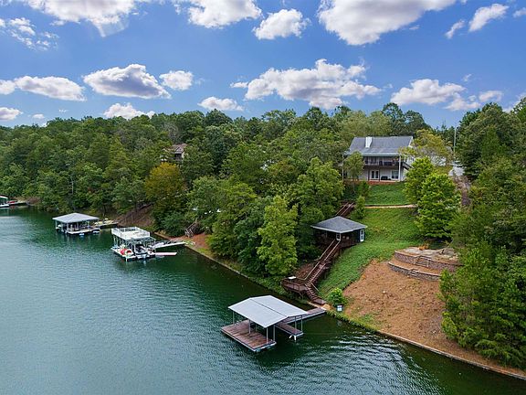 Wide water views with deep, year round water! Located on the south end of the lake with 163 feet of shoreline, seawall in place, & screened in gazebo overlooking the water. This home was just remodeled which includes all new hardi siding, interior & exterior paint, hardwood flooring, tile in bathrooms, kitchen cabinetry, granite countertops, tile backsplash, new lighting, landscaping, & much more. The main level offers 3 bedrooms including the master suite and an additional bathroom. The upper area features a bunk room and a full bath. The terrace level is very spacious with a rec room, living space, 2 bedrooms, & a full bath. A detached 2 car garage makes for great boat storage. A cart path leads to a firepit area and gazebo. The floating dock features a boat slip and sun deck.