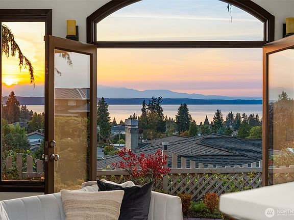 Welcome home to this well-maintained Tudor-style 2-story treasure perched at the top of a private drive, safe and secluded at the end of a cul-de-sac with unmatched privacy and breathtaking Sound & mountain views! A grand staircase greets you inside, where oversized windows, vaulted ceilings in the living room, and a skylight bathe the home in natural light. Refinished hardwood floors, plush new carpets, and sparkling new countertops in kitchen & baths shine throughout. Western sun exposure nourishes figs, apples & more from mature fruit trees. Relax in the hot tub, host BBQs on the big patio, and enjoy an extended driveway that adds security for play. A favorite spot for prom, homecoming, and photos.