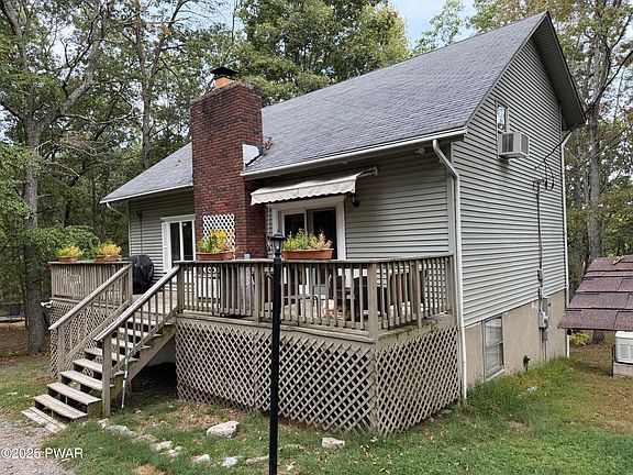 This charming contemporary Chalet-style home in Pocono Mountain Lake Estates, offers the perfect blend of rustic character and modern convenience. Situated on a serene, nearly one-acre, double sized lot, this 3-bedroom, 2-bathroom home provides a private sanctuary with a convenient U-shaped driveway and an attached one-car garage.The bright, open living room with its striking vaulted ceiling and hardwood flooring is the heart of the home. Exposed wood beams and a cozy brick fireplace create an inviting atmosphere, while large windows bring in views of the surrounding woods. A full unfinished basement offers a significant footprint of potential for your personal touch. A bonus room that could be used for all types of purposes that you can think of.Enjoy peace of mind with a whole-house Generac generator and a security camera system. The spacious back deck creates a private outdoor retreat, perfect for enjoying the tranquil wooded landscape. Lake access is just a short walk away from the home. With Shawnee Mountain skiing and golf and Bushkill Falls nearby, this home is your gateway to year-round recreation, perfect for a primary residence or a private mountain getaway.