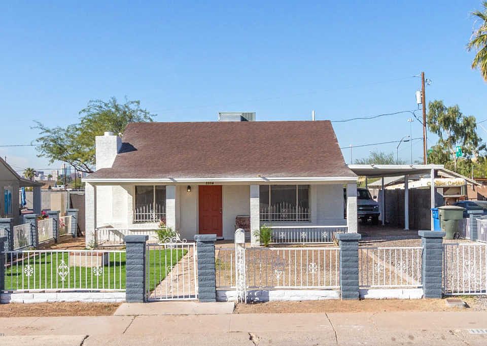 Absolutely Charming 1947 Bungalow Style Home tastefully remodeled. Great curb appeal, front porch entry w/wrought iron & brick columns fence. Soothing palette, beautiful neutral tile floors, cozy fireplace for those chilly AZ evenings, ceiling fans, updated wall mounted lighting. & open floor plan. Spacious eat-in kitchen features stylish kitchen counters, SS appliances, & plenty of white cabinetry w/hardware. Generous sized bedrooms, ample closets, & 2 upscale baths. Designer tile & mirrors. Huge backyard w/endless possibilities. Covered patio & room for a pool, toys, & garden!! Will not disappoint. Close to Restaurants, Shopping, & more.