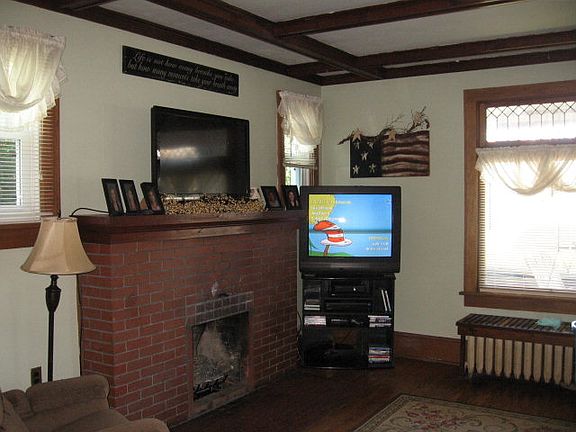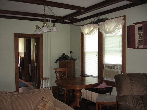 Brick home with 6 Bedrooms & 2 Baths. Lots of original woodwork & hardwood floors plus brick fireplace in LR. Windows are mostly new except those w/etched glass to keep the charm of the home. Really nice foyer w/beveled glass front door & sidelights, wood staircase, patterned wood on ceiling. Living Room has beam pattern in ceiling, FP, w/dining area. New kitchen w/oak cabinets plus wall pantries & ceramic tile floor. Family room on 1st floor at back plus full bath w/wainscot, 2 linen closets & vinyl. 2nd floor has 6 bedrooms w/hardwood floors plus a full bath. All new plumbing, roof is 7 years old, new siding on back addition, newer water heater, new side entrance at family room. Huge welcoming front porch, nice yard, plus 5-car garage. Lots of character and space inside and outside!!