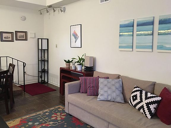Furnished 2Bedroom/2Bathroom two-story Capitol Hill townhouse apartment available for 6-12 month lease. Six-minute walk from Eastern Market and the Eastern Market metro station. Easy walking distance to the Navy Yard, Marine Barracks, and restaurants on Barracks Row and Pennsylvania Ave. The apartment: Cozy and charming space with private patio, equipped with a washer/dryer, dishwasher, central A/C and heat. Details: Upstairs bedroom: Accessible by spiral staircase, this sunny bedroom has an adjacent full bathroom and walk-in closet. Furnished with a queen size bed, desk, and end tables. Downstairs bedroom: Features an exposed brick wall and wall-to-wall bookshelf, large closet, and windows overlooking the front yard, which faces south. Furnished with a full size bed and end tables. Living room/Dining area: Cozy and comfortable, with a high ceiling, raised-hearth brick fireplace, and terracotta floor. Two-story window behind spiral staircase provides soft, natural lighting. Furnished with a TV, sofa, coffee table, dining table and chairs. Back patio: Concrete patio great for chilling and grilling extends to mulched garden space. This fully fenced space backs up to back yard of neighboring home. No alley access and distance from street offers security and solitude. Parking: Street parking with required permit. Please email with contact info to schedule a showing or receive more info. Monthly rent: $3,290 + utilities. Lease for 6-12 months. Credit check and one-month security deposit required. Available May 1, 2022. Each person over 18yo must submit their own application and go through a credit/background check.