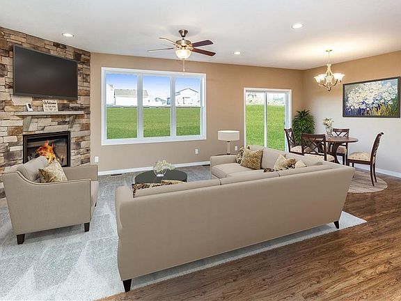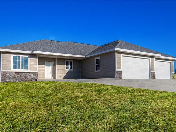 This brand new construction, custom built, zero entry, 8 car garage home is move in ready! Open floor plan. Great storage in the large kitchen with lots of cabinets, pull out shelves, and a pantry. LVP flooring in kitchen, halls and dining area. Gas fireplace in living room. Two guest bedrooms share a guest bath. Master bedroom on opposite side of house with a large walk in closet. Master bath includes dual vanity sink and tiled walk in shower. Laundry room has storage, sink, front load machines, and walls have extra insulation for sound proofing. Xmas light switch in mudroom closet. Basement includes a finished bath and the rest is drywalled ready for you to customize. Plumbed for water softener. Drainage for house is gravity drained to open air. Large 2 car garage gives access to a HUGE 6 car attached garage/shop that's heated and insulated. Some photos are virtual staged for reference. Driveway, sidewalk and patio slab will be poured as soon as weather permits final grade.