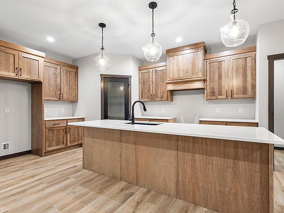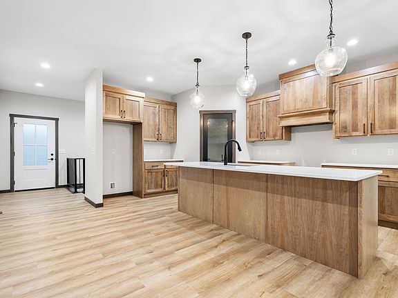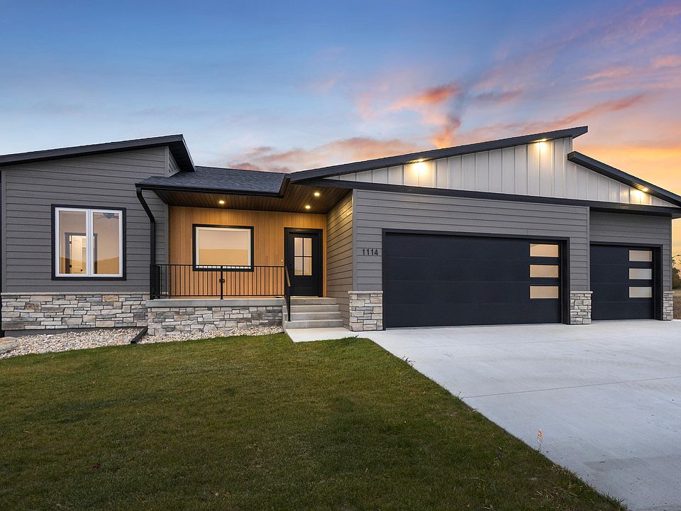 This stunning modern ranch by Windrose Homes is nestled in Timberline Addition with pond views. Enjoy quartz countertops, a fireplace feature wall, and a covered deck perfect for relaxing or entertaining. The spacious primary suite features a tile shower, custom closet, and large windows that fill the home with natural light. With 5 bedrooms, 3 baths, and a fully finished walkout lower level with a large family room, this home offers room to spread out in style. The oversized garage is extra deep for boat storage and includes a 12.5'x15' room below—ideal for yard tools, seasonal décor, or hobbies. Premium finishes, thoughtful design, and incredible views make this a one-of-a-kind property. Owner Greg Kneip is a licensed SD real estate agent. HOME UPGRADES INCLUDE: