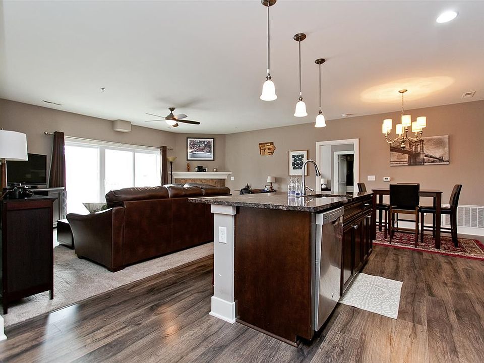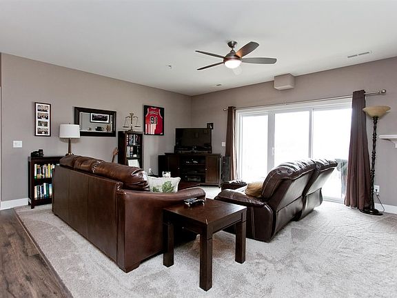Main floor condo w/covered balcony views golf course. Sharp functional open floor plan 9' ceilings, kitchen/dining open to great room w/fireplace & slider to balcony. Good sized living area, breakfast bar, granite, gas stove. Db front coat closet in entry area, pantry closet, laundry. Master has dual vanities, walk in closet, large windows in both bedrooms. Secure bldg. Convenient to dog park, parks, pedestrian bridge to Iowa River area, bike path, couple shops in Peninsula! Seller says great place to live!