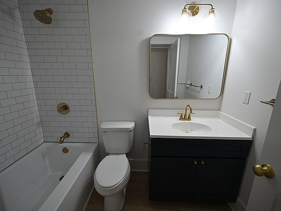 Bathrooms w/ brand-new tile showers & tubs, chic vanities, and brushed brass fixtures