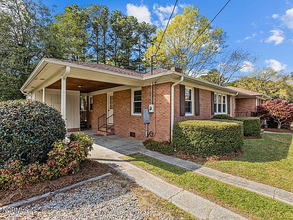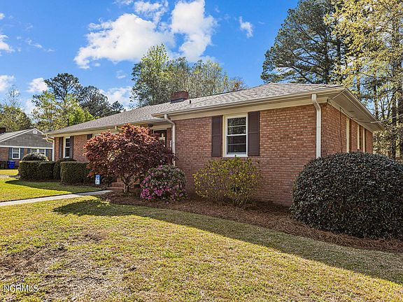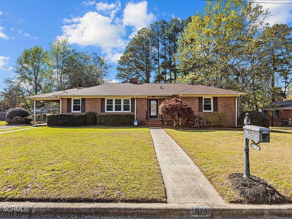 If you are looking for a traditional brick ranch, you will love this beautiful, well maintained 3 bed/2 bath brick ranch located in the college court subdivision 1 mile from ECU. With lots of natural light, and gorgeous hardwood floors, you will find a den with bookcases and fireplace, formal living and dining room, an eat-in kitchen, a primary bedroom with en-suite bath and walk in shower and a guest bath with tub/shower combination. New blinds installed throughout the home, high quality air filters changed regularly and lots of floored storage space in attic. Outside, you will find a carport with storage, a new deck (2021), new HVAC (Aug 2022), additional parking area added with gravel and landscape timbers (2021), New moisture barrier under the house (2022), New Roof (2017), Replaced sub floor, shower pan and floor tile in Walk-in Shower(2020) and other repairs completed under the home in 2020 by licensed general contractor. Washer, Dryer, Refrigerator convey