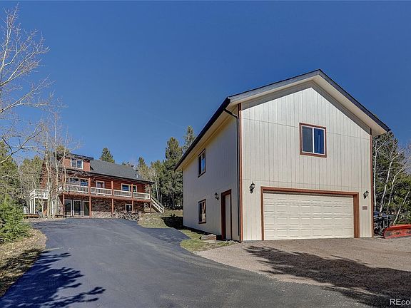 Beautiful log home with panoramic views! Pride of ownership with thoughtful updates and meticulous maintenance. A sunny, South facing, paved driveway with beautiful aspen trees welcome you to this immaculate 4 bedroom, 3 bathroom home, on 2+ acres with picturesque views of Staunton State Park, plus more! There is an amazing, finished living space above the garage that could be ideal for an office, workshop, yoga or dance studio, etc.! The space above the garage includes a pellet stove and a closet. This charming mountain home’s high end features include a Coleman Generator Powermate 6250 Watts, a 1-year old roof, and Champion Windows with warranty. The bright living room features a vaulted ceiling and one of the home’s two additional pellet stoves, creating a cozy space. The inviting dining area adjacent to the kitchen is perfect for easy living and entertaining. The kitchen also includes its own balcony. Enjoy the magnificent mountain views from the deck accessible from the living area. The main floor also includes a bedroom, and an updated ¾ bathroom. The walk-out lower level features the bright family area with a pellet stove, and access to the large patio. The lower level also includes a bedroom with beautiful built-in shelving and a walk-in closet, an updated ¾ bathroom, and the utility/laundry area. The upper-level features two additional bedrooms, including the primary room, and a full bath. Immerse yourself in the Colorado lifestyle on your large patio, with a stunning atmosphere and abundant wildlife. Close to 285 for convenience, 1 minute to the local firehouse, and the school bus picks up at the end of the driveway. Total square footage includes the finished space above the garage. Welcome to your Colorado dream home!