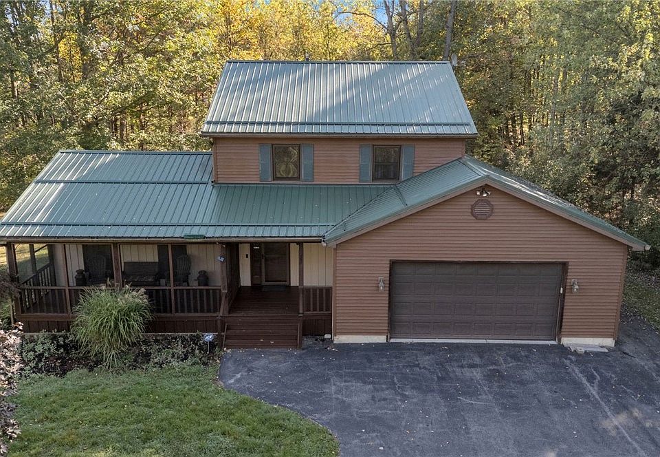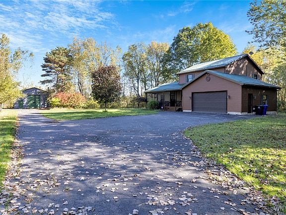 Welcome to your private oasis at 11142 Crego Rd, set on 8.3 serene acres in the Akron School District. Built in 1995, this 1,800 SF home with 3 bedrooms, 2.5 baths, and a 2.5-car attached garage sits 300’ off the road down a private blacktop drive, offering peace and privacy and within driving distance to town. Step inside to a well-constructed home highlighted by a vaulted family room surrounded by walls of windows, a cozy gas-insert fireplace, and a sliding door leading to the rear yard. The massive eat-in kitchen offers an abundance of cabinets, extended counter space, breakfast bar seating, and additional pantry. A tastefully updated half bath completes the first floor. Upstairs, the primary suite boasts raise ceilings, dual closets and a 4-piece bath with soaking jetted tub, stand-up shower, newer vanity, and private commode. Two additional bedrooms are serviced by a full bath with a generous walk-in shower. The lower level features 9' ceilings, secondary walk up stairwell to garage access, a high-efficiency York furnace (2010) with central A/C, a hardwired whole-home generator, abundance of shelving and updated electrical with underground service to a 200-amp panel. Modernized lighting includes timer-based integrated stairwell and hallway floor illumination. Enjoy the outdoors from the large covered and screened front porch overlooking a spacious cleared yard. The exterior is protected by metal roofing on both the home and outbuilding, plus low-maintenance vinyl siding. A true highlight of this property is the 1,440 SF metal pole barn—fully insulated, plumbed, with 12’ ceilings, multiple garage bays, integrated floor drains, thick concrete floors, ample power, built-in workbench, and wood-burning stove ready! Perfect for hobbies, storage, or workshop needs. With over 1,250’ of wooded depth with carved out trails, privacy and versatile space, this is a rare opportunity to combine comfortable living with exceptional land and utility. Don’t miss your chance!