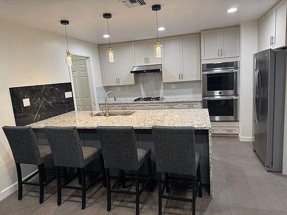 Fully remodeled home in Granada Hills, ready to move in, offers a spacious single-story layout with 3 bedrooms and 2 full baths. Enjoy an upgraded kitchen with quartz counters, shaker cabinets, double ovens, and a large island that opens to the dining area with fireplace and family room overlooking the private backyard. Outside features a covered patio with fans, gazebo area, Trex deck, and no rear neighbors perfect for relaxing and entertaining. Additional highlights include a massive driveway with RV parking, owned solar, dual-pane windows, and central air with Nest thermostat. Included: washer, dryer, refrigerator. Furniture is optional home can be leased furnished or unfurnished for the same price. Property is also available for insurance adjuster housing with a minimum 6-month lease at $7,700 per month. The garage is converted into a permitted ADU and has a tenant.