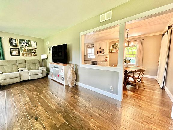 Welcome home to this beautifully updated 3-bedroom, 2-bath ranch nestled on a spacious .8-acre lot surrounded by mature trees and lush greenery. From the moment you arrive, the home’s crisp white exterior and manicured landscaping offer undeniable curb appeal. Inside discover a bright and airy living room with great flooring, windows that let in tons of natural light, and a cozy layout perfect for everyday living or entertaining. The heart of the home is the stylish, renovated kitchen—boasting custom white cabinetry, granite countertops, stainless steel appliances, a subway tile backsplash, and a shiplap ceiling that adds character and warmth. The adjoining dining area features a built-in workspace with a sliding barn door—ideal for working from home or staying organized in style. Retreat to the spacious primary suite complete with plush carpeting, a walk-in closet, and a spa-inspired en-suite bath featuring dual vanities, and a gorgeous walk-in tile shower. Two additional bedrooms are generously sized and share a well-appointed full bath. Outside enjoy the backyard —complete with a concrete patio for relaxing or entertaining, a picnic area, and room to roam. The detached garage provides ample storage or workshop space. Just minutes from everything you need, this home offers the best of both worlds—comfort and charm on a generous lot. Key Features: 3 Bedrooms, 2 Full Baths, .8 Acre Lot with Mature Trees, Updated Kitchen with Stainless Steel Appliances, Beautiful Floors & Shiplap Ceilings, Primary Suite with Dual Vanity & Walk-In Shower, Home Office Nook with Barn Door, Large Detached Garage & Ample Parking, Private Backyard with Entertaining Space. Don’t miss your chance to own this move-in-ready gem