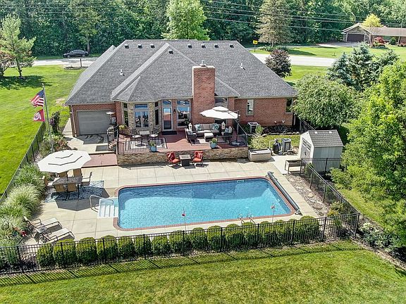 Beautiful custom brick ranch with an amazing private setting with heated inground pool '12, liner '22, roof and gutters '19, well pump, carpet and pool pump 21', front door, master bath, skylight '20, pool fence '14, bamboo deck '16, updated kitchen, quartz counter, bamboo hardwood floors and gas log fireplace '17. Windows, front porch & sidewalk, railing '18. Water softener '20. Furnace '15. Basement finished water proof, vinyl flooring, half bath '22. Built-ins with quartz counters in dining room and family room with electric fireplace.
