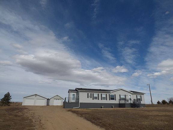 Rare opportunity to own a home and land on the edge of town and horses allowed. Incredible Black Hills views to the South as well as West toward Wyoming. Nice manufactured home, 3 car garage and 2 acres and more. 3 bedroom, 2 bath. This property does allow for most animals including horses (check covenants). Garden spot and 2 sheds will stay. Most all appliances will stay and seller would be interested in selling washer/dryer/freezer and spare fridge in Den if someone where interested,and the cupboard in the back porch will stay as well as any attached shelving in home and garages. Located near town and great accessibility. Seller isn't away of an road maintenance fee but there could be one. Foundation is concrete pad's a buyer if needing financing would need to get a Engineers Certificate. Improvements made by this seller are: New front and side decks were added with engineered Trek decking as well as New skirting, crawl space door and also new paint on skirting and shutters. Engineered plank flooring in living room, bath and hallway. Much of the interior has been repainted,. New blinds, New Thermostat. A couple of new windows in the small garage were added. When seller purchased the home they were told refrigerator was 2 yrs old approx. and shingles were put on in 2017. Property does go to the 2nd fence to the North. There is a strawberry patch on West side of garage.