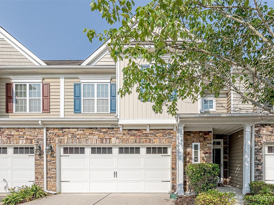 Situated in the heart of desirable Stone Creek Ranch this three bedroom townhouse has been updated to perfection and is move-in ready. Hardwood floors welcome guests into the 2-story foyer. The open concept floor plan unites the great room, dining room and kitchen. Great room features gas fireplace and tons of natural light. Chef's kitchen features ample 42" cabinets, granite counters, tile backsplash, & stainless steel appliances including a gas range. Primary suite is large with walk-in closet and en suite bathroom including double vanity, glass enclosed shower and garden tub. Two additional generous bedrooms on the second floor. Privacy fenced backyard is highlighted by custom paver patio and wonderful automated retractable sun shade. 2 car attached garage provides storage and parking solutions. Wonderful community including amenities and amazing proximity to south Charlotte's best shopping, dining and entertainment.