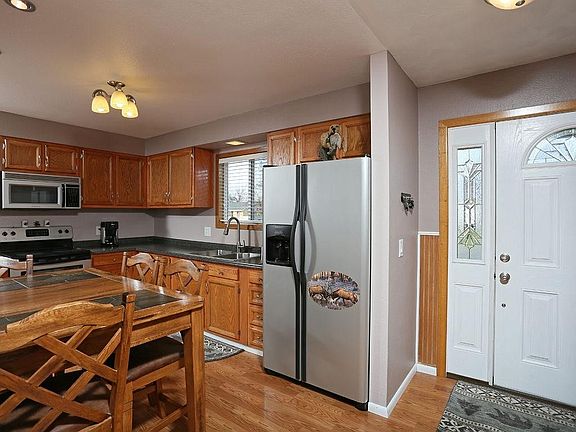 Updated home ready to move in! Kitchen/dining combo that opens to a spacious living room with wood stove. 3 bedrooms on the main with 2 more egress bedrooms in the basement along with a large family room. Private fenced yard with underground sprinklers, shed and a large covered patio with skylight & recessed lights. Huge oversized 2-car garage plus additional parking in the front and back perfect for recreation vehicles!