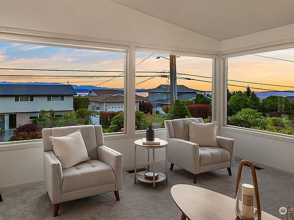 West-facing 4-bed Edmonds Bowl home w/ sunset Sound & Olympics sightlines. Formal living w/ vaulted ceilings & inviting gas fireplace. View deck seamlessly extends living & entertaining outdoors, leading to a fully-fenced backyard complete w/ pickleball court, basketball hoop, & sunken hot tub. Chef-style kitchen w/ Jenn-Air gas range, slab granite countertops, & shaker-style cabinetry. Informal living provides access to 2nd deck. Corner upstairs Primary Suite looks out to views & park-like backyard w/ mature landscaping, fruit trees & raised garden beds. En-suite bath & WIC. 3 spacious beds up, 1 down. Lower level boasts huge rec rm w/ 2nd gas fireplace & wet bar. 2-car garage. All within easy walking distance to everything Edmonds offers.
