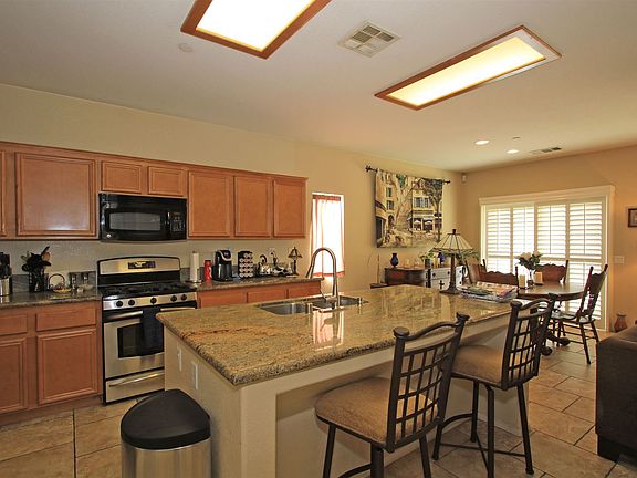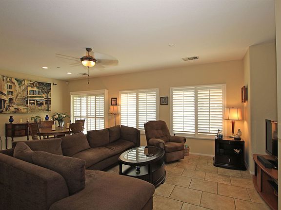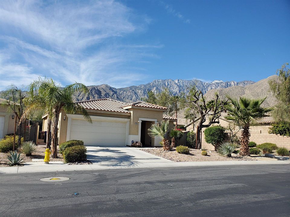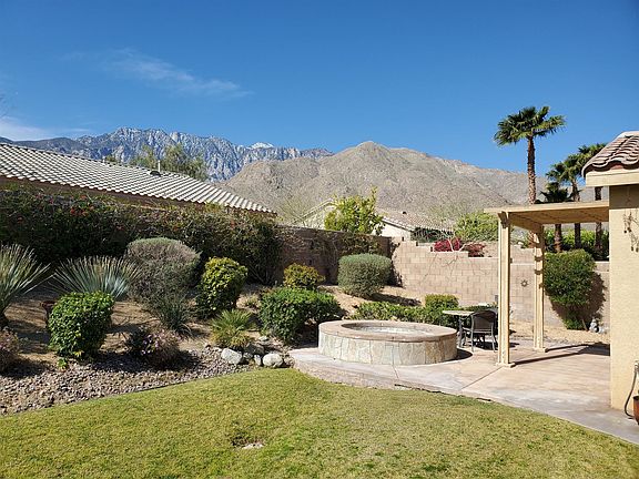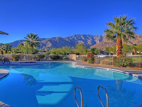 Upgrades abound in this Beautiful 3 bedroom, 2 BA home located across from community pool. Backyard has spa and spectacular South facing Mountain views. Kitchen upgraded with gorgeous slab granite counters, stainless steel appliances, and large pantry with upgraded glass door,.Beautiful plantation shutters throughout, great room has gas log fireplace and media niche. Central air and whole house attic fan will keep you cool in the warm summer months. Bedrooms have mirrored closet doors. Inside laundry room with washer, dryer included. Tile floors except in 2 bedrooms. Gated community has super low HOA dues 100/month with amenities such as pools, spas, tennis courts, basketball court, BBQ, playground, walking trails, and roving security. Located just off Palm Canyon Drive, close to PS Tram, shopping, dining, and entertainment.