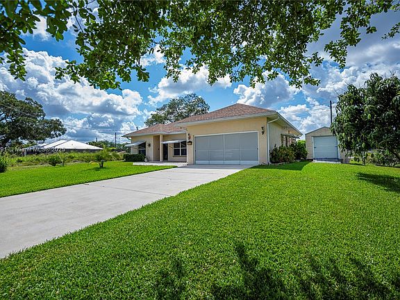 Take a look at this WELL MAINTAINED home located in Port LaBelle. This home sits on an oversized corner lot with beautiful landscaping, trees, and lots of curb appeal. The exterior of the home features concrete block construction, a new roof, a well for irrigation, a sprinkler system, and a storage shed. There are storm shutters on the windows for hurricane protection. The interior of the home features tile flooring throughout the living areas, and vinyl plank flooring in the bedrooms. The kitchen has been recently updated with new cabinets, marble counter tops, back splash, and new appliances. There is also a R.O. System under the sink for added water filtration. Watch the beautiful sunset on the screened lanai. The back yard is fenced for added security for your kids and your pets.