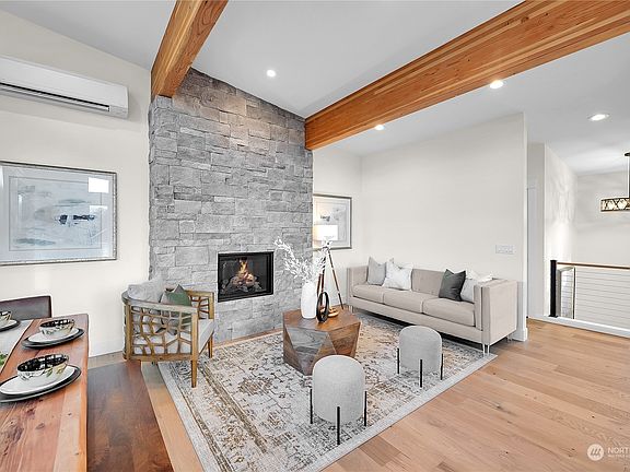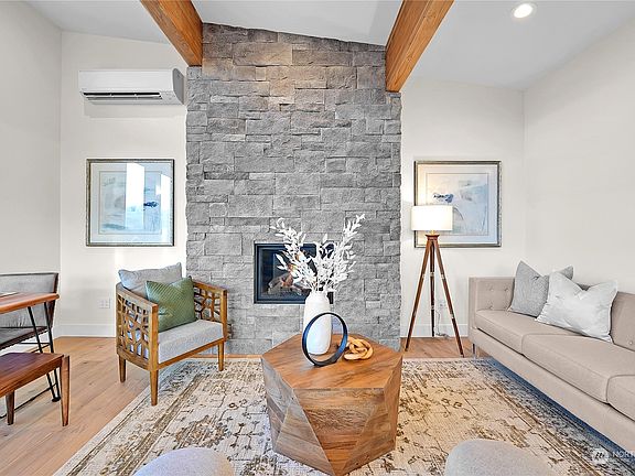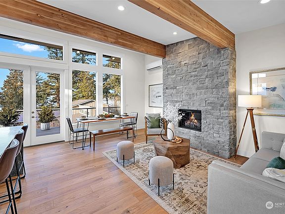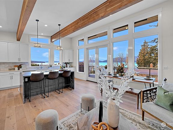 Enjoy spectacular sunsets over the San Juan Islands from your gorgeous new custom-built home! Upper level w/open concept living/dining rooms & kitchen adorned by exposed beams, floor to ceiling stone fireplace, engineered hardwood floor & amazing views. Kitchen is equipped w/stainless-steel appliances, granite countertops & pendant lighting. Primary bedroom located on upper level enjoys water views, high-sloped ceiling & beautiful ensuite bath w/radiant floor heat, large walk-in tiled shower & double sink vanity. Enjoy French Door access & built-in heaters on your spacious deck, perfect for year-round outdoor living & entertaining!
