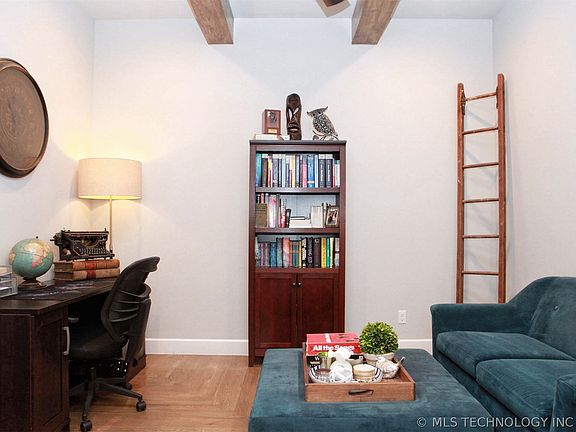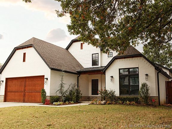 $20,000 PRICE REDUCTION. Stunning contemporary home built in 2019. 4 beds, 4 full baths + a downstairs office w/glass pocket doors. One of the larger ones at 3813 sq.ft in desirable midtown close to the Gathering Place & Brookside. Walk into the beautiful entry with herringbone wood floors, soaring high ceilings & wooden beams. Spacious great room w/a wall of windows overlooking yard. Family room opens to the Chef’s kitchen which features a large center island w/bar seating, double ovens, stainless appliances, large twin fridge/freezer, wine fridge, oversized pantry, wooden ceiling & a wonderful breakfast/dining room. Primary bedroom is downstairs w/nice wooden tray ceiling, hardwoods, spacious walk-in closet that connects to utility room and an En-Suite bath. Primary bath has large separate shower, double vanities, & an abundance of storage & counterspace w/a gorgeous spa-like soaking tub. 2nd downstairs bedroom has a vaulted wood beamed ceiling & a private bath. 2 more bedrooms upstairs each w/private baths plus a wonderful game/media room w/a new dry bar & wine fridge. New shades throughout entire home w/automatic ones in the living, dining, game room & primary bedroom. Backyard paradise w/new cedar pergola, extra concrete added for more patio space and a built-in grill.