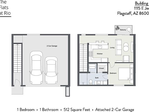 Brand-new 1 bedroom/1 bath loft above private, attached 2 car-garage in The Flats at Rio. Very unique to have an attached 2-car garage under the flat for tenants parking. Apartment has a balcony with views, an open floorplan with stainless steel appliances, washer/dryer in unit, a/c and plenty of upgraded finishes throughout. The Flats at Rio is located off Pine Knoll Drive, a great central location of Flagstaff and walking distance to NAU & CCC. Shorter Lease Terms will be considered for those in need of flexibility. Currently under construction, estimate move-in will be May 1st, 2023. Owner/Agent/Builder. Units are in high demand; $500 holding fee to secure a unit (non-refundable and applied to security deposit at move-in.) Building 1 Availability as of 4/10/23 Unit 203 (Middle-Unit): $2085 Unit 204 (End-Unit): $2160 Security Deposit: $1,500 ($1,000 Refundable, $500 Non-Refundable). Utilities: Tenant responsible for electricity (units are all electric, no gas). Landlord responsible for water, trash and sewer. Parking: Tenants with 2-Car Garage will not receive Parking Lot passes. Cars must be parked inside of garage. Pet Policy: No pets are preferred. $500 pet deposit per approved pet. $25/month pet rent per approved pet. Rules: All persons 18 years and older need to apply. Tenant to abide by the neighborhood CCR's. Renter Insurance required. No smoking or vaping. SHORTER LEASE TERMS WILL BE CONSIDERED Unit is currently under construction, move-in date is pending Occupancy Certificate. Tentative May 1st move-in date.