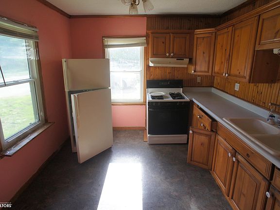 Perfect for first-time buyers or investors, this property sits on a beautiful 94' x 160' timber lot and includes a spacious 24' x 30' double garage with a wide concrete driveway. The home features vinyl siding, a charming 6' x 14' covered front porch. Inside you'll find a notty pine kitchen with stove and refrigerator included. There are two bedrooms, one full bath with laundry hookups. Outdoor amenities include a storage shed, picnic table, and firepit—all staying with the property. A great opportunity to own a peaceful, affordable retreat with plenty of potential!