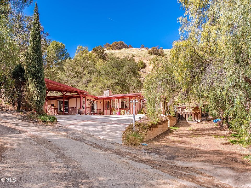 Very unique property located in the south-east hills of Simi Valley. 2 bedrooms plus 2 baths with 1458 sq ft living space (Buyer to verify sq ft., some additions to the property have been completed without permits) and sits on 23,000 sq ft lot. The living room has a warm and cozy wood burning fireplace. Remodeled kitchen features wood cabinets and granite counters. Open beam ceilings throughout and a formal dining room with a wood burning stove. Large master bedroom and master bats. the 20' by 12' laundry room could be used as a third bedroom. Very unique rear yard features a covered patio, large storage shed and bird aviary and opens to wide open hillside. At the right of the property is a 75' RV access or additional parking.