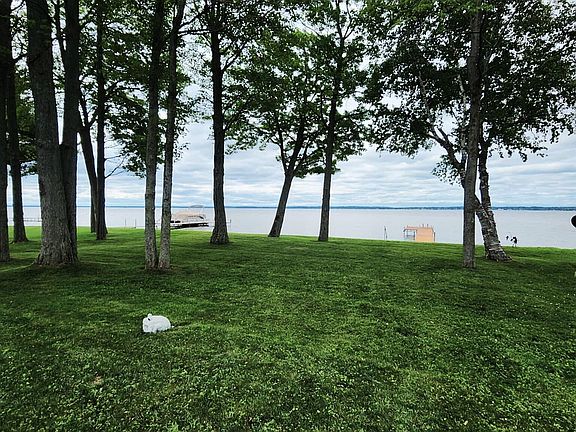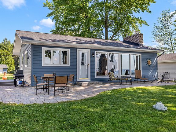 Absolutely adorable lakefront home offering 3 bedrooms, 2 bathrooms, beautiful cedar interior, vaulted ceilings with large open cedar beams, updated kitchen with granite counters, new flooring throughout living room, kitchen and hall, new windows, 2 garages and a 4 x 8 storage shed. Beautiful maintenance free vinyl siding in a rich dark blue accented with white trim, composite decking at entries and a beautiful paver walkway with large brick paver patio. Relax and enjoy the panoramic view of the lake with breathtaking sunsets.. On windy days, you can gather around the firepit across the street and enjoy the peaceful setting of the canal overlooking a natural setting that is home to an abundance of wildlife just across the canal. Attached garage offers a secondary entertainment area along with a 24 x 40 garage across the street for ample storage. Spare garage and adjoining lot are located on the canal with an additional 117 ft. of waterfront with access to the lake by pontoon as well. Home has been meticulously maintained with close attention to detail. You will fall in love from the moment you step inside. Call for your private tour and start making lasting memories in this fantastic lakefront getaway!