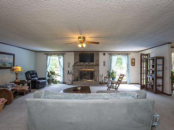 single level brick ranch, 2 car attached aggregate concrete driveway patio and plenty parking. 40x60 shop with electric water & insulated 15x60 leanto Great location. Shop has a guest bedroom & Bar. Great for your working man and a great gathering place to share with friends! Well taken care of home and overbuilt shop.
