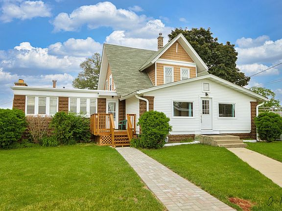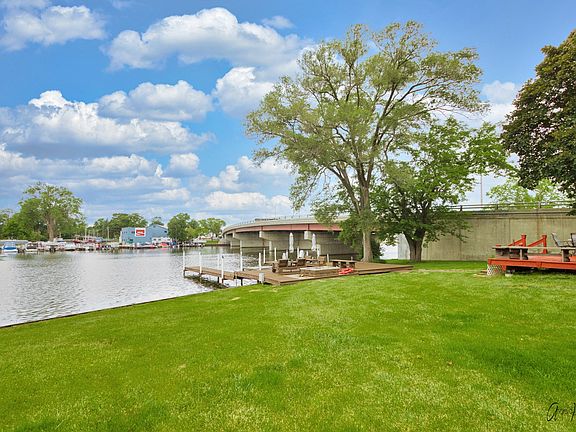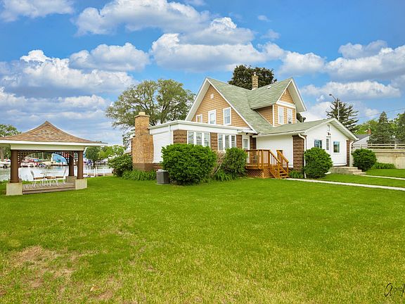 Stay-cation all year long in this Fox River Gem! Located in a no wake zone you can relax on your large deck off the great room or chose to be right on the water lounging on a second deck with a fire-pit and twin piers. On some nights you can hear music from the Riverwalk Gazebo which is located directly across the Fox River from the home. The McHenry Riverwalk and Downtown areas are easily accessed by foot, boat, or car. Enjoy viewing the Fox River from the primary bedroom "wall of windows" as you are lulled to sleep by the calming waters. The motorized power blinds lower over the windows with the press of a button and raise them as you awaken to the energy of a new day of Fox River living. This very large primary bedroom has a ton of character with the uniquely tiled floor, the wood burning fireplace, nice size closet, private bathroom with updated step-in tiled shower and its own exterior entrance. Entertain or relax with everyone in the great room that displays plenty of original woodwork in this 1904 home with an impressive staircase leading to bedrooms 2 and 3 with hardwood floors and another full bathroom with tub/shower combo. Both bedrooms have ample closet space and one has outside access to the flat rooftop for sunning. The kitchen is spacious with cabinets galore and an abundance of countertops and...just for fun...a hidden door that leads to the basement. There is an eating area and a passthrough peninsula to eat at or for serving your guests. A 4th bedroom and powder room are right around the corner as is the main entrance of the house with lots of storage area as well. On the way down to the basement you will find the door to the outside kennel and when you get all the way down you enter the laundry room with a 2 sink laundry tub and lots of space for easy access storage, access to mechanicals. In addition there is a crawlspace for even more storage which also has access from the outside. The detached 2 car garage has a large workshop that has a heater and a wood burning stove. The machinery inside the shop will stay. There is a gazebo beside the house to view the water and enjoy the gentle breeze and quiet activity. A garden area is near for vegetable/flower enthusiasts. There is a video security system in the house and it will stay. Electrical has been updated, HVAC is new. Too many improvements to list since the current owners bought in 2016. They really did take this home from a Diamond in the Rough to a Fox River Gem! Schedule your very own private viewing today