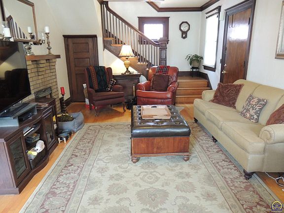 Quality, character two story home near downtown & ESU. Many beautiful features throughout the home: refinished hardwood floors, sliding solid wood French pocket doors, colorful & beautiful stain glass & lead glass windows, living & dining room fireplaces, decorative wood trim & crown molding, ornate metal door hardware & vent covers, beveled built-in mirrors in bedroom doors. Large remodeled kitchen w/appliances and butler staircase to second level. 4 bedrooms & 3 bathrooms; primary bedroom has a small balcony, main floor laundry, a bathroom on each living level. You will be amazed by the wonderful finished attic easily accessed via stairwell & large amount of built-in cabinets/drawers for storage. Full basement with finished family room & high efficiency furnace & possible choice of wood heating. Most windows replaced for efficiency. Alley & driveway access to garage/parking. Covered front porch overlooking front yard with large mature trees.