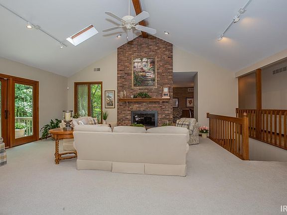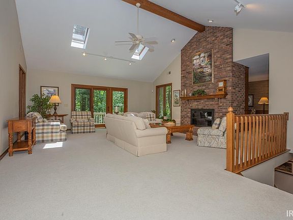 Welcome to this stunning, wooded retreat in Plantation Estates on Evansville's Northside. This serene home, resembling a private lodge, boasts a modern open-concept design that greets you with a spacious foyer, immediately making you feel at home. The foyer showcases expansive windows framing the picturesque backyard and flows seamlessly into the great room. To the left, stroll on sleek engineered wood floors to the fully equipped kitchen. This culinary haven features custom oak cabinetry, an island cooktop, a wine cooler, double built-in ovens, and access to a screened front porch ideal for summer evenings. Adjacent to the kitchen is a formal dining room and a stylish half bath. The great room impresses with its vaulted ceiling, large picture windows, a floor-to-ceiling brick gas fireplace, and sliding doors leading to a spacious wooden deck. Off the great room, a cozy second living space includes a built-in bookcase and serene views of the woods. The main level also includes a luxurious primary suite with an updated tiled shower, a separate bath, and a cedar closet, as well as a separate laundry room with custom cabinetry. Two additional bedrooms share a contemporary full bath. Downstairs, discover a fourth bedroom with an adjacent full bath, another inviting living area with a wet bar, a wood-burning fireplace, and a walk-out patio leading to a hot tub. Additionally, there is a vast unfinished storage room. This home perfectly blends modern comfort, elegance, and natural beauty, making it the ultimate retreat.