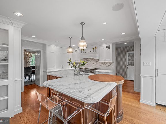 The curb appeal is just the beginning of your love affair with this stunning property! This spectacular three-story expanded Colonial sits on a private, beautifully landscaped 1.4-acre lot on a quiet Northside Villanova cul-de-sac. Warm, yet sophisticated, this "Forever house” is a rare opportunity, set on one of the most desirable lanes in Villanova. Thoughtfully renovated from top to bottom, the home blends timeless elegance with modern luxury, offering space for both grand entertaining and everyday living. From the gourmet chef’s kitchen to a custom pub room, a wine cellar, and lush grounds with pool and spa—every space has been designed with comfort and style in mind. Enter the property through stone pillars on either side of the circular drive. The first floor welcomes you with a gracious foyer featuring charming millwork and hand-pegged wood floors that flow into the fabulous eat-in kitchen, showcasing Halkett custom cabinetry, double-thick marble countertops, custom mosaic backsplash, 6-burner Wolf range with grill, separate Thermador refrigerator and freezer, wet bar with beverage frig, and a unique coffee bar pantry. The adjoining dining room is perfect for large gatherings, while the oversized family room connects to the elegant step-down living room with gas fireplace, crown moldings, French doors, and serene yard views. Just off the kitchen is a mudroom with built-ins and garage access. A breezeway/sunroom leads to the custom pub room, paneled with reclaimed wood from a Chicago speakeasy, complete with electric fireplace, powder room, and French doors to the fire pit area and backyard—an entertainer’s dream. This versatile space could also function as a private office with its own entrance. The finished lower level offers a 1,500-bottle temperature-controlled wine cellar, gym, laundry, and storage. The second floor showcases the luxurious primary suite including a sitting area, gas fireplace, and two walk-in closets with brand-new custom cabinetry. The marble ensuite bath boasts heated floors, imported fixtures, television, custom cabinetry with charging station, and a private WC. Four additional bedrooms and four baths (three ensuite) complete this level, including a full in-law/guest suite featuring a kitchenette, sitting room, laundry, and spacious bedroom with full bath. The third floor provides flexible living space with a great room, office, and an additional full bath. A game room offers abundant cabinet storage and access to a large walk-in attic storage. Outdoor living shines with a large bluestone patio and awning-covered sitting and dining area overlooking the pool, spa with waterfall, and lush landscaping with hydrangeas, mature trees, and plenty of flat yard space for play, pets, or relaxation. Located in the award-winning Lower Merion School District and close to many private schools, universities, country clubs, shopping, dining, and major highways to Philadelphia, New York, and beyond—this exceptional home offers convenience, luxury, and Main Line living at its best. Showings start Thursday the 18th. Schedule your private tour today!