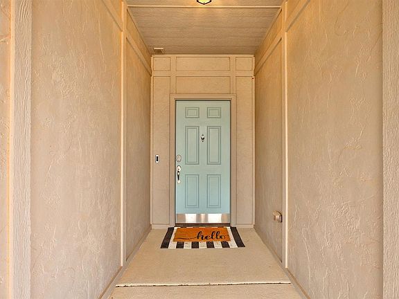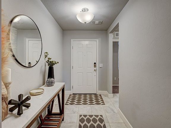 Welcome to this gorgeous home in Tradan Heights! This meticulously-maintained and spacious property features three bedrooms and a large, open floor plan. Walk through the charming turquoise door into an inviting entryway, and to the left, you'll find two large bedrooms with large closets separated by a bathroom and linen closet. A spacious living room and a beautiful kitchen with a large, centralized island are down the hall, with a dining space and door that leads to the covered patio. On the other side is the primary bedroom with a fantastic walk-in closet and an en-suite bathroom with a walk-in shower and gorgeous vanity. The garage contains an above-ground storm shelter that can keep eight people safe from Oklahoma weather. The home comes with a security system and luxury window coverings on all windows. The stainless steel appliances and washer/dryer convey with the property, and the furnishing are available for an additional fee. Don't miss this charming home in this sought-after neighborhood with community amenities, including a walking trail and park! Buyer to satisfy themselves of covenants, restrictions, and HOA bylaws.