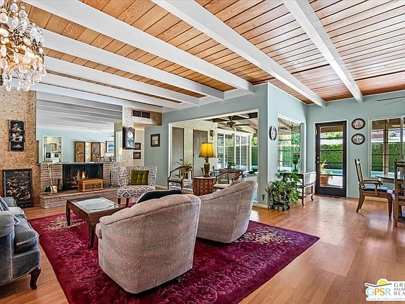 $80,000 price reduction! This charming mid-century home built in 1952 in Deepwell Estates has been lovingly cared for by one family since 1982. The home has hard flooring throughout, wonderful beamed ceilings, and large windows to the backyard where a sizeable pebbletec pool and dramatic mountain views await your enjoyment. The landscaping includes tangelo, grapefruit and meyer lemon trees, and a dense ficus hedge in front secludes the circular driveway from the street. There is a 2 car garage as well, adding to the ample parking capacity. The roof-mounted A/C was installed in 2019, and there's an added 2023 mini-split unit in the primary bedroom. The bonus room, with access from the backyard is large and can serve as a game room, media room, family room or office. The foam roof was re-coated in late 2023. This wonderful home is ready for the next owner to personalize and enjoy for years to come. Seller will consider all reasonable offers.