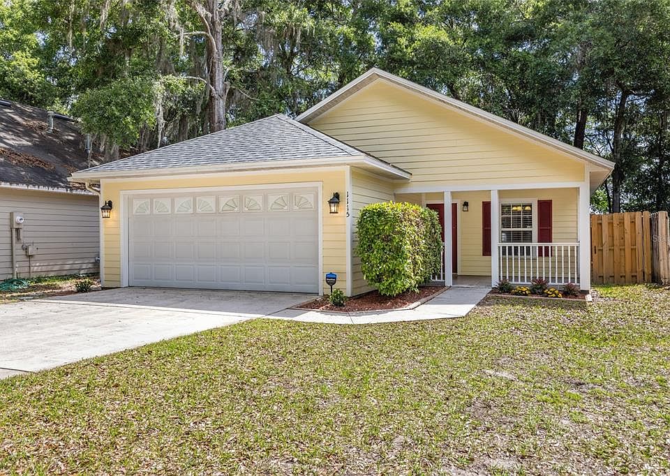 One or more photo(s) has been virtually staged. Welcome to this charming 3-bedroom, 2-bathroom, 1,260 sqft home with updates galore! As you approach the home, you will appreciate the new roof that was replaced in 2023, along with fresh exterior paint, 2 car garage, and a well-maintained front yard. The generously sized front porch is the perfect place to welcome guests, pass out candy to trick-or-treaters in the fall, or relax in the evenings and wave to neighbors walking by. As you step into the entry way, you're greeted by a large and spacious great room with vaulted ceilings and crown molding. To the right is the dining area and kitchen, and to the left is the light and bright living room featuring new french doors leading out to the patio. Enjoy preparing and serving food to family and friends in your updated kitchen which has recessed lighting, a new backsplash, new stainles steel appliances, and recently replaced faucet. Thanks to ample counter space and cabinetry, you will never be short on storage or prep space in this kitchen! The open concept layout of the space makes it a breeze to host get togethers for football games or holidays, and the in-wall wiring for your surround sound system in the living room will be put to good use when watching tv or listening to music. As you make your way through the home you will find many additional updates including fresh paint throughout the entire house, new light fixtures, and new ceiling fans. The bedrooms and bathrooms are located down a short hallway, at the back of the home. The primary bedroom has a en-suite bathroom with newer vanity, mirror and fixtures, along with a tiled walk-in shower with sliding glass door. The second bathroom is located between the two additional bedrooms. From the living room, step outside onto the patio leading to a fully fenced backyard, with a privacy fence all the way around. This well-maintained home offers modern comfort and is move-in ready. Lastly, you will love the super convenient location! Just a short distance to schools, parks and minutes drive to North Florida Hospital, UF, UF Health Shands, Shopping, I75 and so much more. This is a must see, so schedule your appointment for a tour today!