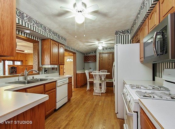 Solid built ranch home situated on a corner lot with mature trees, circular driveway. Located at the end of the channel with water access and pier and boat slip. Easy access to the Fox River for summer fun! Home features 4 bedrooms, 2 full baths, 2 gas fireplaces, vaulted ceilings in living room and hardwood floors in kitchen and family room. Large, light and bright family room with slider to patio. NEW furnace and A/C (Oct. 2017). Loads of storage. 2.5 car garage. Nice sized patio with gas hook up. Great home to personalize and make your own!