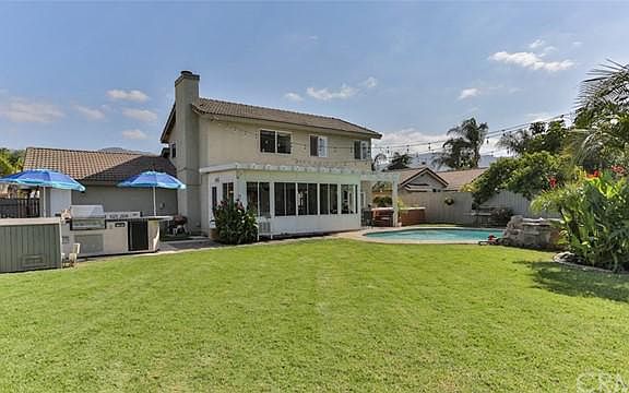 Location, Location, Location! Low Taxes, NO HOA's, Large Lot, RV Parking, Built-in Gas Barbecue and a Private Tropical backyard with a refreshing Swimming Pool and Spa! This lovely home offers 3 bedrooms, 2.50 bathrooms and a 3 car garage. Updated with gorgeous Italian Porcelain flooring that looks like wood, new carpeting and recently painted throughout. The kitchen is spacious with plenty of cupboard space. The dining room area features a custom built-in wine rack, made with re-purposed materials. It's a must see! The closed in permitted (approx 280sqft added to the square footage of the house)California Room is a comfortable living area to sit and enjoy the backyard view. This Tropical Oasis backyard is absolutely BEAUTIFUL! The sparkling swimming pool with rock features and a slide, helps make the summer days go by! The luscious green grass, palm trees, flowers and landscaping is the perfect setting for an evening of relaxation, to view the City Lights and Mountains. Only minutes away The Cleveland National Forest offers fantastic hiking and mountain biking trails! Dont miss your opportunity, to purchase this home in a highly desirable area of Corona!