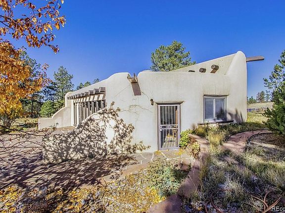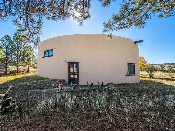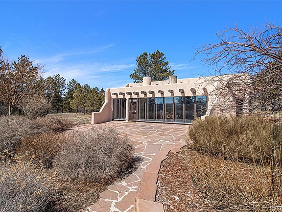 Imagine a home reflecting the style of the adobe pueblos of Taos and the haciendas of the southwest. This unique home is situated on 10+ beautiful and peaceful acres in Franktown. This sustainably constructed home was built from local, natural materials including custom doors from Placitas, NM, flagstone from Lyons, pine planking out of Sedalia and beams from Poncha Springs resulting in a home that is harmonious with the area and evokes the style of upscale Southwestern living. The natural energy efficiency of adobe construction is enhanced by south facing solar windows, insulating shutters. The upper clerestory windows facilitate ventilation as well as adding natural light to the living area. Heating is facilitated by the fireplace with a enhanced smoke path to boost energy efficiency of this net-zero carbon heating option. Further upgrades of electric baseboard heat powered by solar panels have reduced wood consumption as well as reduced the CO2 footprint of the home. As added insurance against cold weather, or for extended time away, additional baseboard heat is connected to the regular electrical service. As you approach this beautiful home the flagstone patio provides ample outdoor living space. Upon entry into the dramatic open floorplan, the natural light accentuates the great room living area, perfect for entertaining or comfortable living. The kitchen allows easy access to the great room and complements the Pueblo style. As you proceed into the spacious living room, flooded by natural light and showing the same beam ceiling architectural features, it is apparent that there is plenty of useable living area. The primary bedroom with ensuite fireplace connects directly to the bathroom and the guest bedroom provide space for the occasional overnight guest. Private and quiet, but still close enough to civilization. Whether your passion is horses, chickens, or just a quiet pasture, you can find it here.