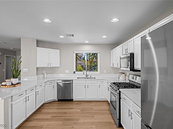 This thoughtfully updated 2-story is located in Fallbrook, a friendly Summerlin community w/neighborhood park & picnic area—just a short walk from Staton Elementary School & less than 10 minutes from premier shopping & dining at Downtown Summerlin, Boca Park, & Tivoli Village. Blending comfort & convenience, the interior boasts new flooring & baseboards, Nest thermostats, & blackout shades in all the bedrooms. The open-concept main level is ideal for everyday living & entertaining. In the kitchen, Samsung appliances, marbled quartz countertops, & a peninsula w/seating make both cooking & conversation easy. Unwind in the family room, complete w/mounted TV & glass sliders that open to the patio for seamless indoor/outdoor living. In the backyard, enjoy a low-maintenance retreat w/new pet-treated turf, raised garden beds, & a large covered patio. A collection of fruit trees—apple, plum, lemon, mandarin orange, & fig—adds natural beauty throughout the property.