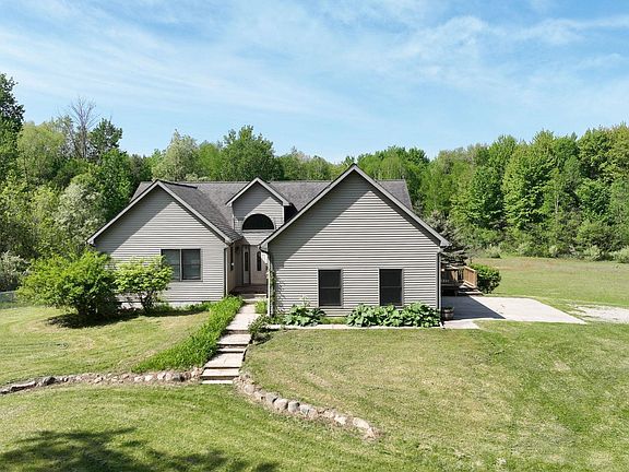 Spacious home with large acreage providing a true sanctuary for those seeking peace and serenity with plenty of room to roam. This property is a nature lovers paradise. This 4 bedroom 3 and ½ bath home has approximately 3500 sq. ft of finished living space. It offers a first floor primary and also first floor laundry. Multiple double glass doors open to the deck, views of nature from every room, an abundance of natural sunlight and fireplace. The large kitchen and breakfast nook is approximately 20 x 20, with vaulted ceilings and open views to the living room and the upper level deck. Imagine curling up on a winter evening enjoying the warmth of the fireplace and watch the snow fall. You can also enjoy a morning coffee from the dining room while deer and wild turkeys linger in the back yard, Downstairs is a walkout with a sliding door to the patio, a large family room, the 4th bedroom and full bath, small office space (all with new carpet), workshop area, craft room/storage room and plenty of other storage. Lower level would make an excellent in-law suite. If you like to entertain either inside or outside this property offers the perfect setting with its open floor plan and large outdoor area. There is plenty of storage for any hobby toys you might have in the 24 x 40 pole barn. This home is located about 15 minutes from both Mt Pleasant and Alma.