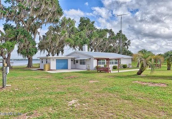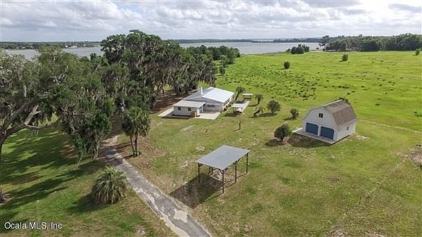 Beautiful cottage home with 4.70 acres on Lake Weir! Enjoy morning coffee on your porch with breathtaking panoramic views of the lake and private beach. This home has been updated with a New roof, New carpet, New AC and freshly painted throughout. Living Room has custom brick fireplace. 1 car garage attached for extra storage. This property also comes with a barn that has a two car garage down below to store your four wheeler's, toys, jet ski and boat. The upstairs loft could be used as a In-law suite or could be finished into an artist studio, Man Cave or office space. This is a must see!!