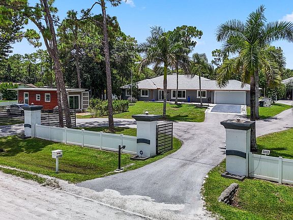 Main House - 2310 sq ft.. Warehouse / Workshop - 1576 sq ft.. Guest House - 320 sq ft.. Sauna / Hot Yoga Studio - 160 sq ft..This house has it all! Situated on a private 1.25 acre lot, behind a brand new remote operated aluminum gate, is your own private compound.. The home has been fully renovated inside & out.. Roof was replaced in 2023.. Complete impact glass windows & doors.. AC & Water heater (tankless) are under 4 years old.The backyard has a small fenced in space that has been used for dogs to play.. There is a gazebo and a koi pond in the back of the property as well, great for private relaxation or entertaining.