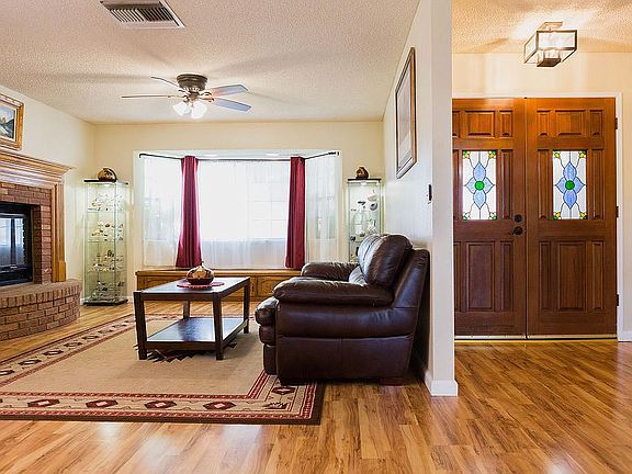 Beautiful 3 bed, 2 bath NorthWest home! Covered front patio leads to double door entry. Welcoming living room w/ fireplace, newer laminate flooring & bay window w/ cabinetry below. Spacious kitchen features stainless steel appliances, breakfast bar for additional seating & ample storage and counter space. French door access to the covered back patio just off the dining space. The master suite is generously sized and provides great natural light, lighted ceiling fan & ensuite bath w/ dual vanity and private toilet. Both guest bedrooms are nicely sized w/ carpeting and lighted ceiling fans. The backyard is the ultimate retreat w/ both covered and uncovered patio spaces to enjoy, lush greenery, custom built pergola, brick planters & a cactus garden w/ several rare cacti and succulents. Your covered back patio is ideally blocked from the wind & sun and comes equipped w/ misters, making it comfortable year round. Ample shade is provided by the mature trees in both the front & back yard. The home also provides great hallway storage space, indoor laundry, dual cooling to help keep electric bills low, RV/boat parking. Workbench in garage, washer & dryer are also included.