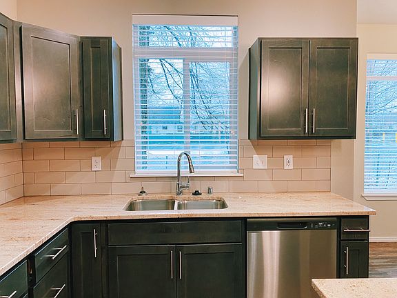 Stained shaker style cabinetsWalk-in closetAutomatic sprinkler systemLarge yardStainless steel appliancesGranite counters