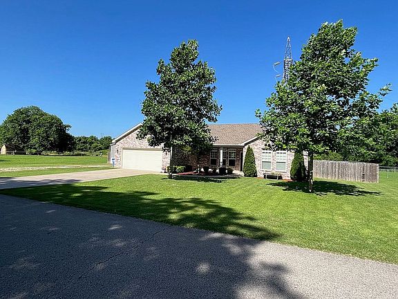Stunning full brick, granite counters, vaulted ceilings, large 4 bedroom (3 include walk-in closets, 4th bedroom has double closet), 2 bath house with 24 x 30 metal shop. Floored attic for extra storage. XL Storm shelter added in 2021. Tons of builder upgrades w/ large fenced in backyard. Kids playset included. Private sandy beach access, close to hwy, town, & keystone lake. HD security system. Fiberoptic internet coming this summer. All appliances stay! Incredible neighborhood, this is a must see!